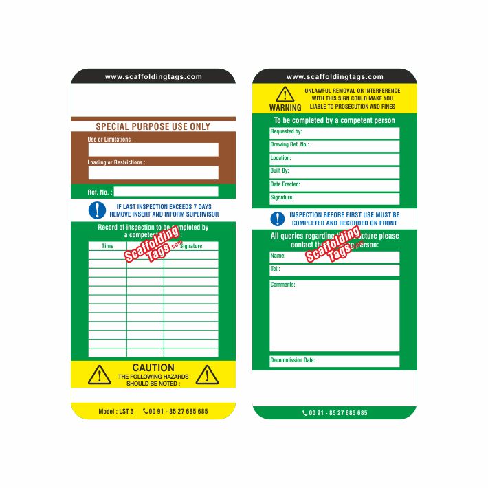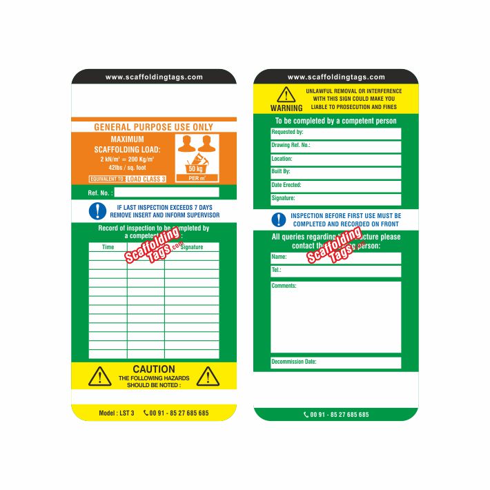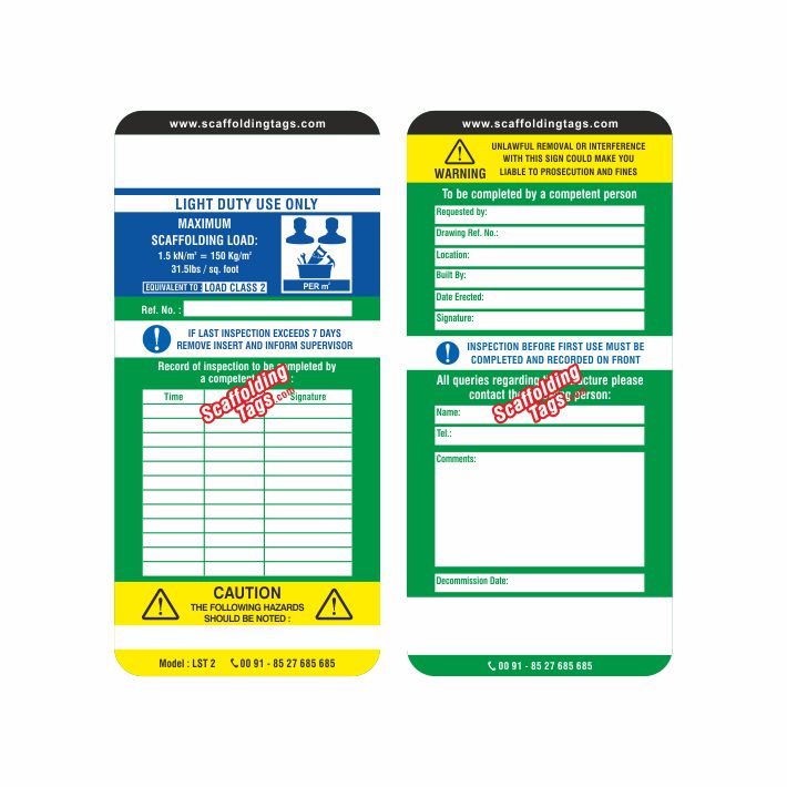 Alternative inserts are available which use colour-coding and pictorial images indicating the maximum load recommendations for the scaffold in question. These are particularly useful for sites where varying maximum loadings are in place.