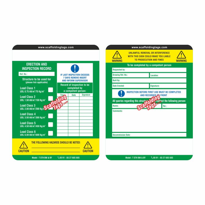 Scaffolding inspection Tag / Insert are designed to operate in conjunction with Tag holder to help identify working at height hazards and efficiently manage inspection procedures.